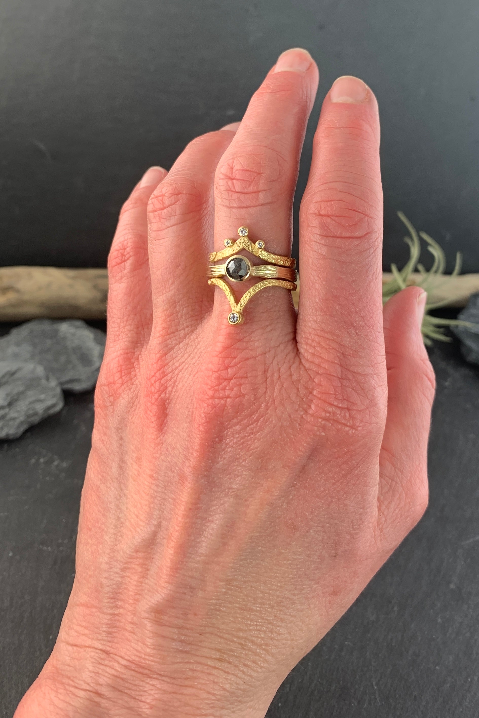 A deep chevron and sparkling diamond add dramatic edge to this 14K contour band! With subtle yet shimmering texture, it’s designed to nest around solitaires of many shapes and sizes or combine with other contour bands for a customized stack with lots of geometric flair.