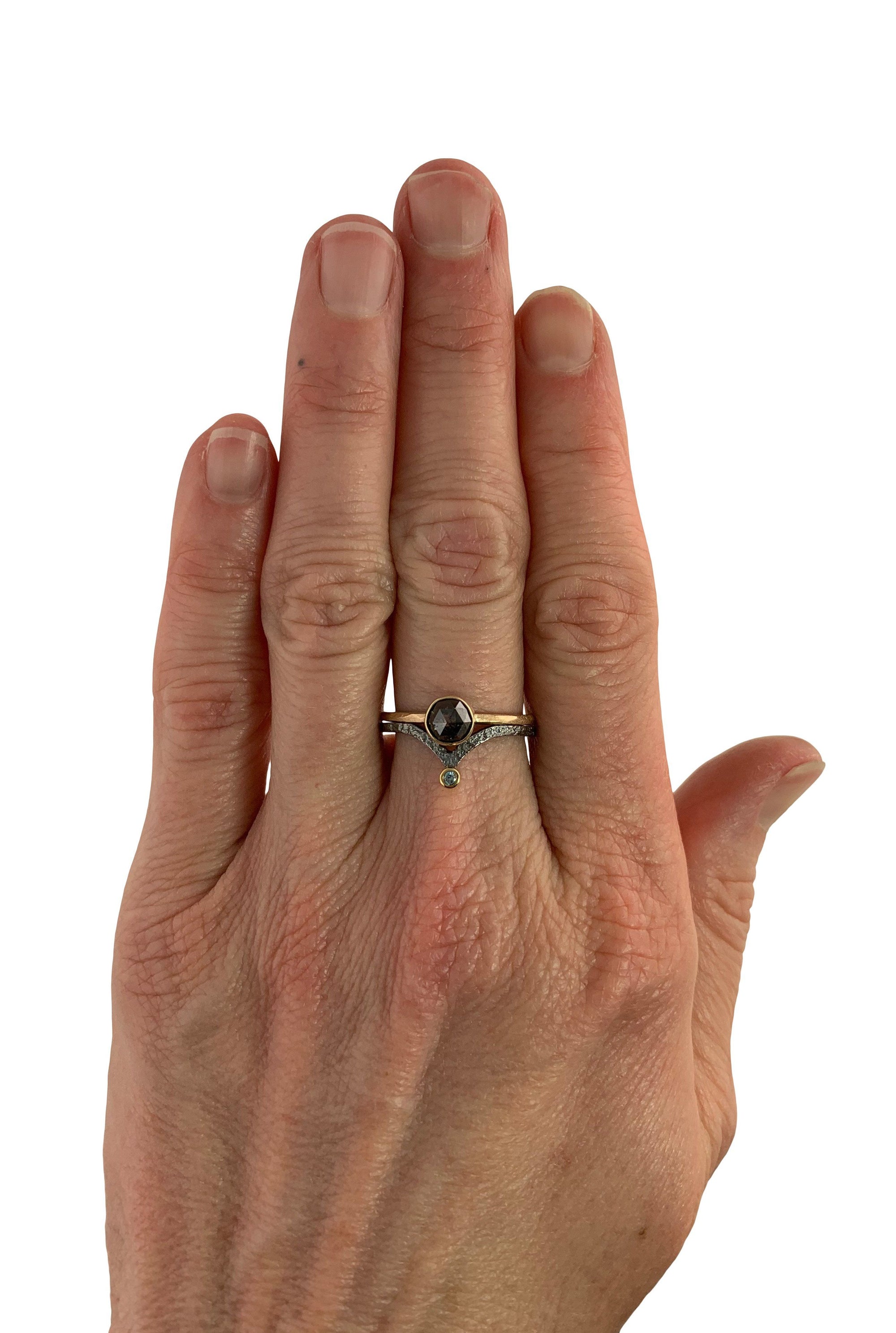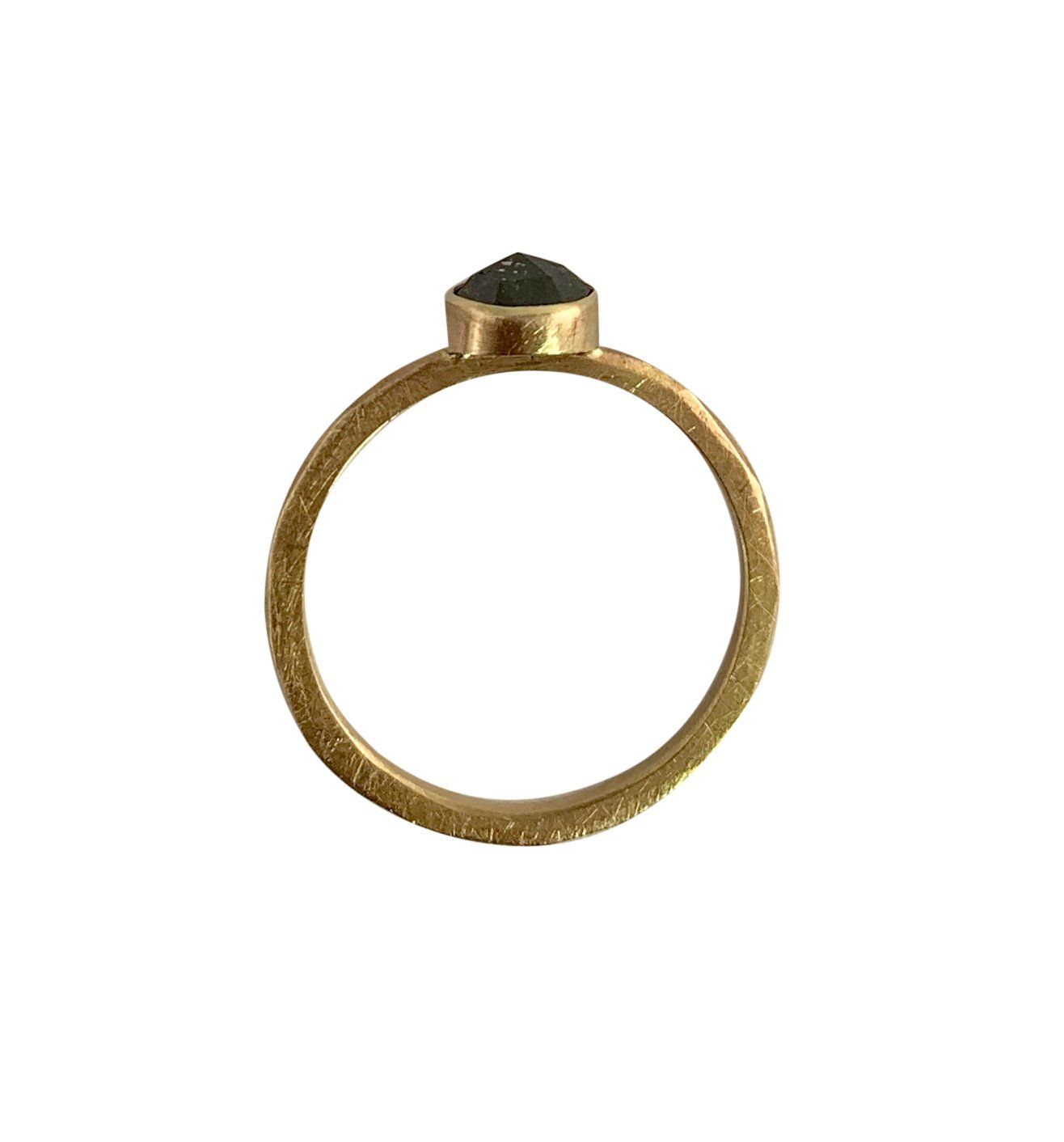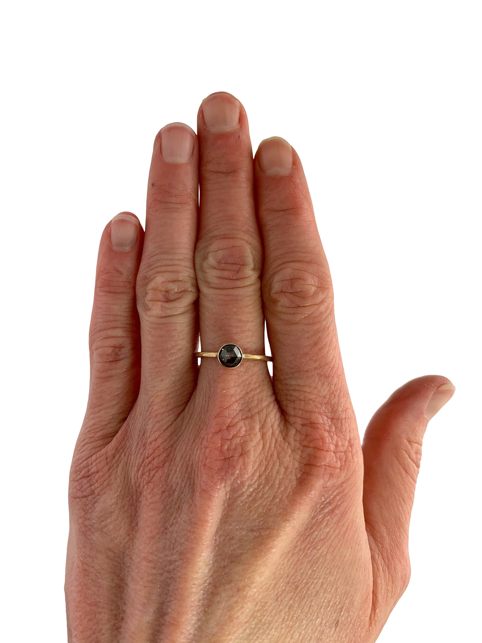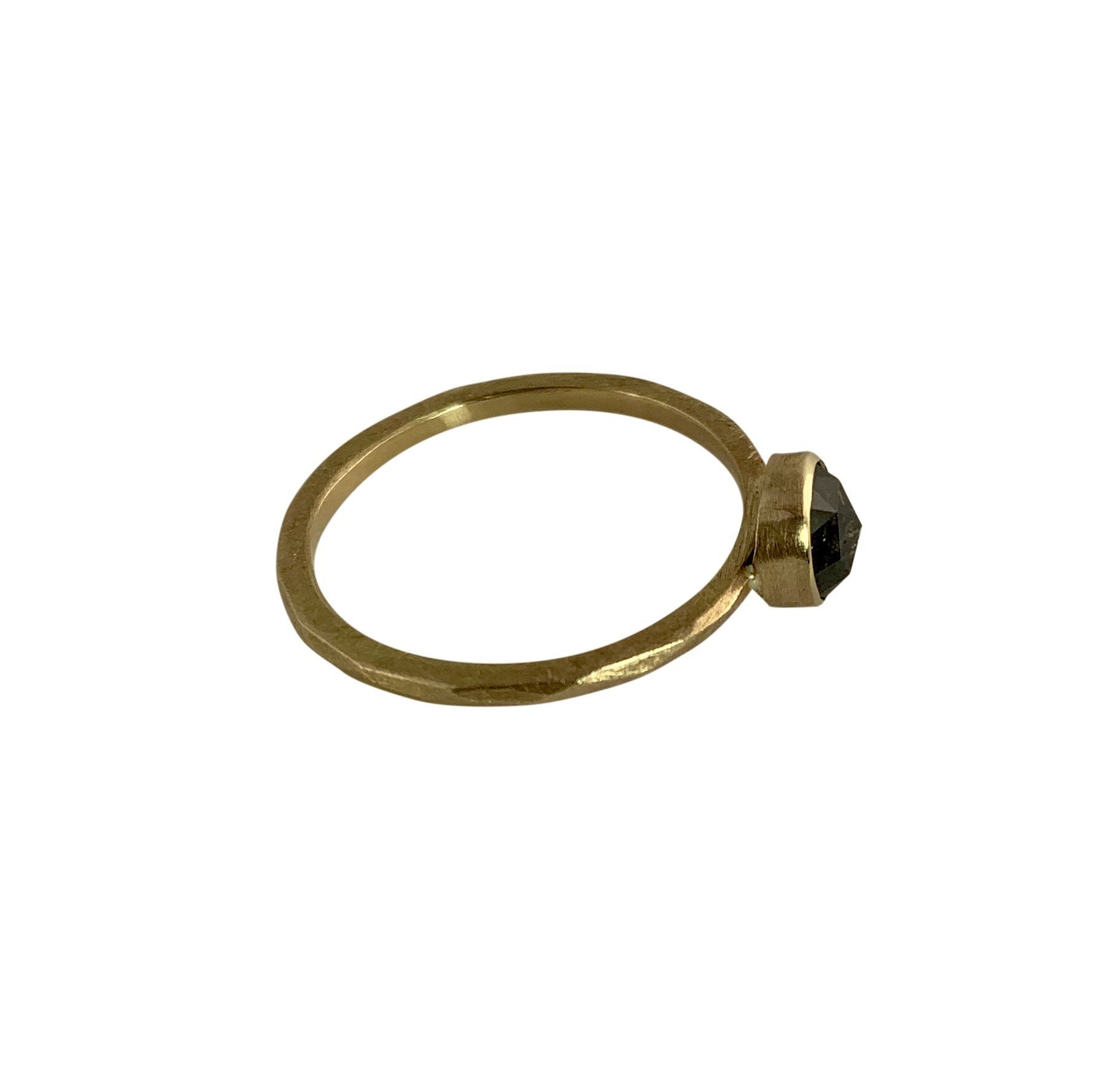 This little sparkler is perfect on it's own, stacked or paired with a nesting band! A moody dark-gray rose-cut is nestled in 14K yellow gold, set on a matte finish faceted 14K yellow gold band. May be stacked with rings 1.5mm thick or smaller.