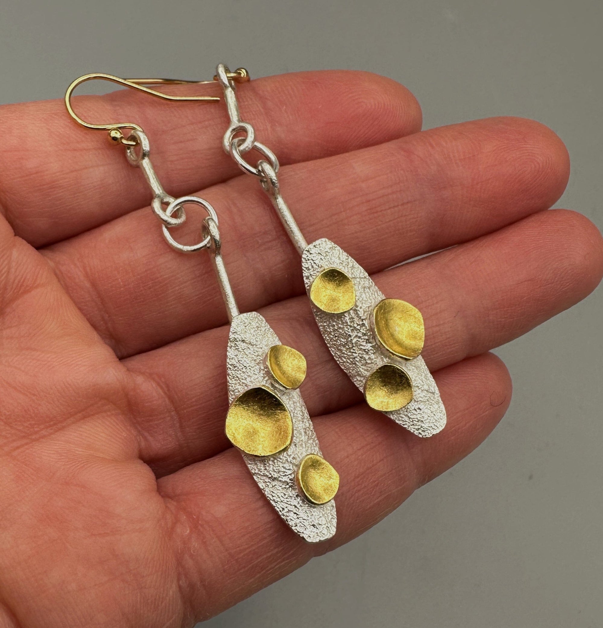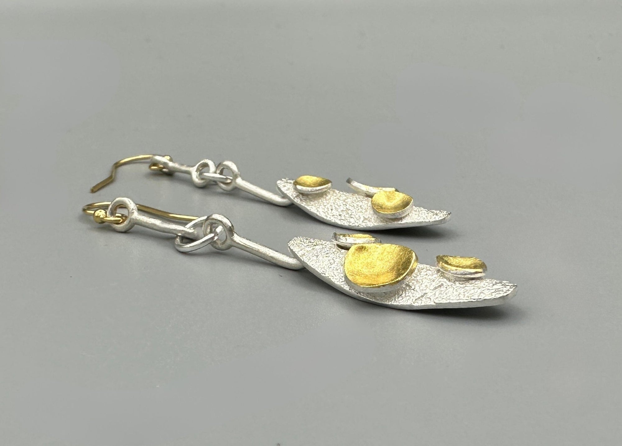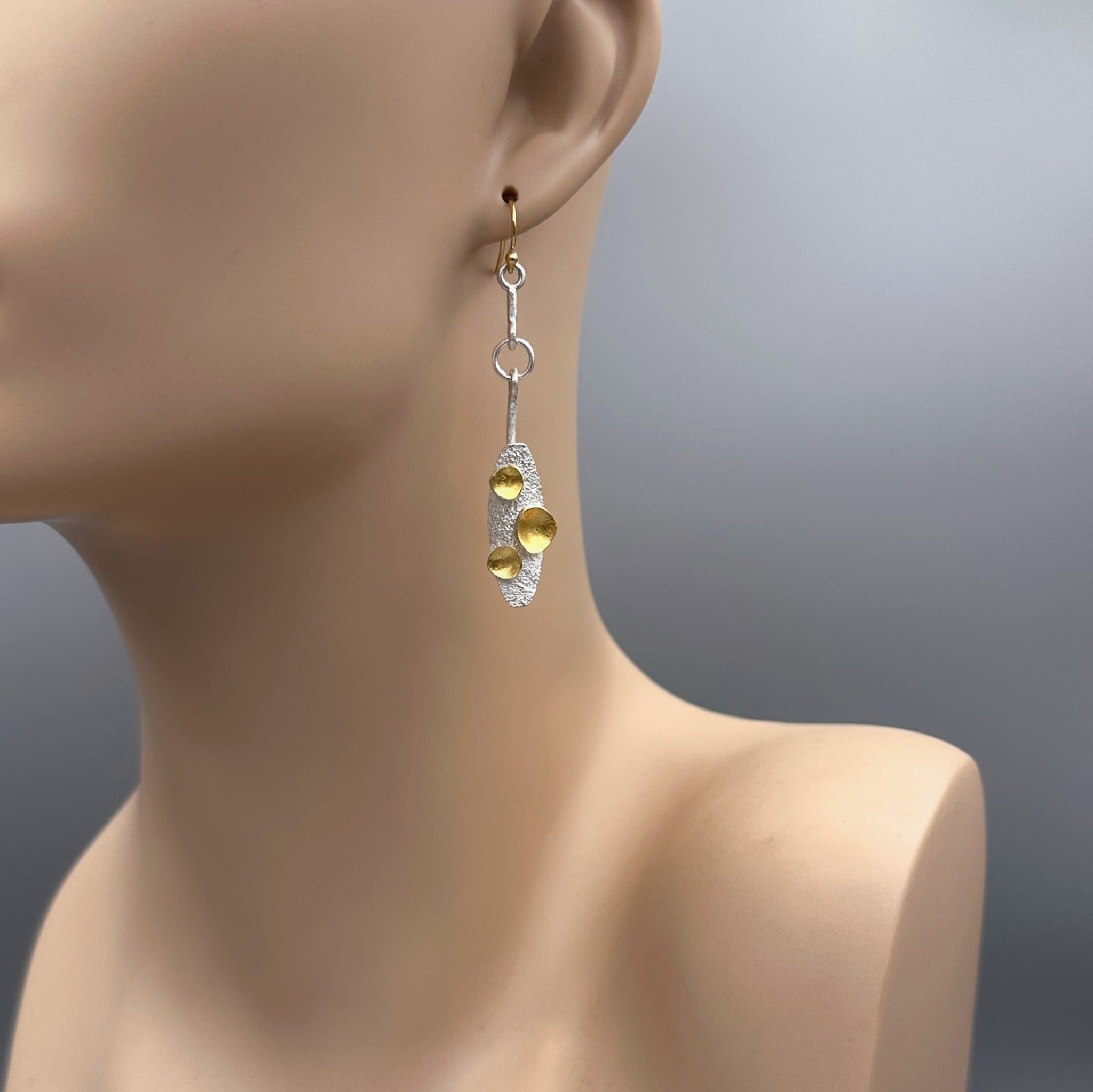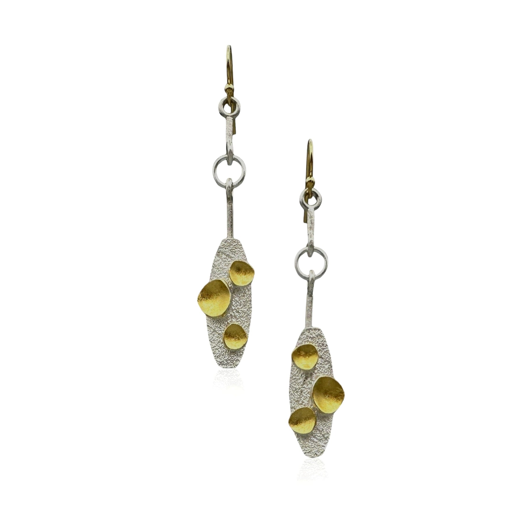 These playful silver and gold drop earrings pop with movement, color and contrast. Marquises of textured silver accented with 23K gold-kissed droplets mix modern lines with organic asymmetry in these lightweight, eye-catching earrings. With gold-filled wires and silicone stoppers for added security.