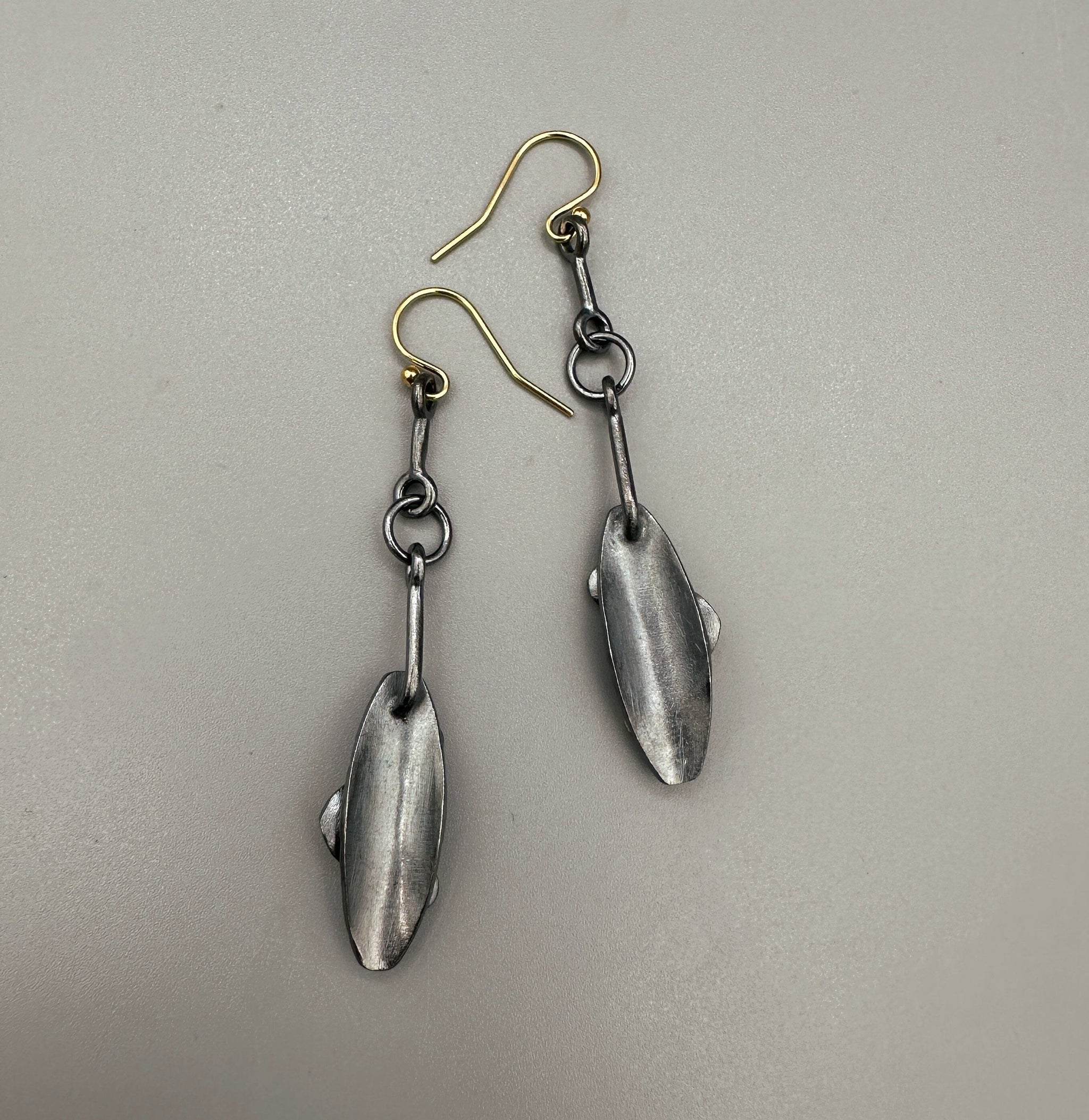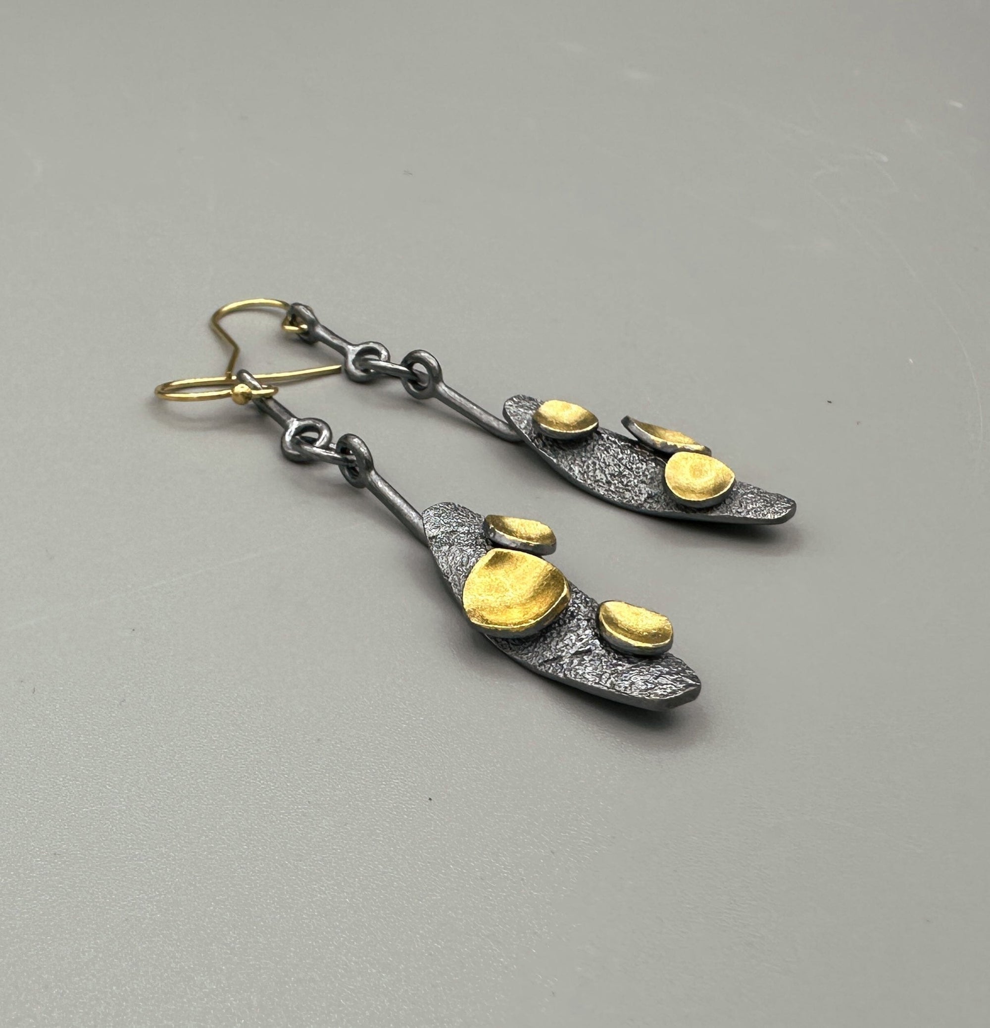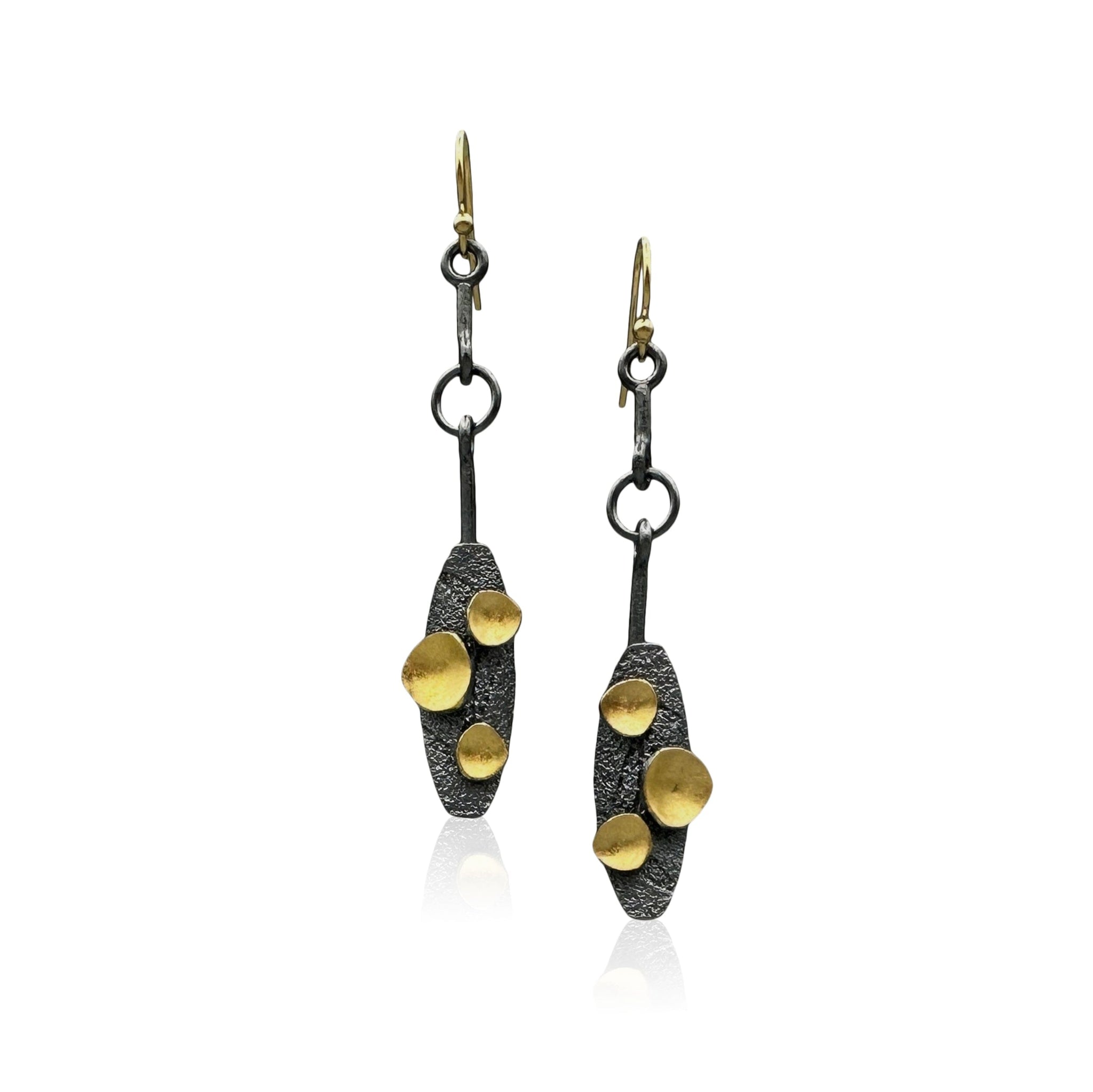 These playful oxidized silver and gold drop earrings pop with movement, color and contrast. Marquises of textured silver accented with 23K gold-kissed droplets mix modern lines with organic asymmetry in these lightweight, eye-catching earrings. With gold-filled wires and silicone stoppers for added security.