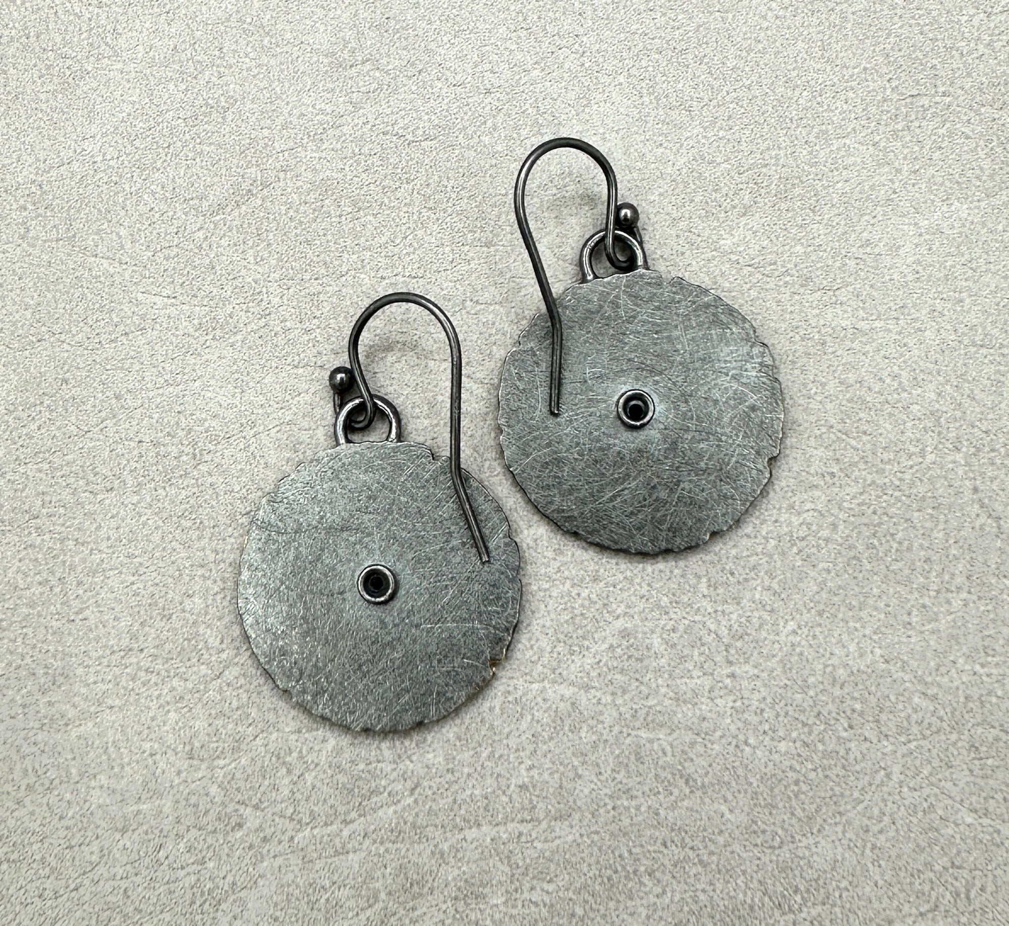 Add a little drama to your everyday look with these oxidized silver and gold earrings. Textured rounds of sterling silver are accented with 23K gold and flush-set diamonds are like little slices of nature that pop with sparkle, color and contrast.