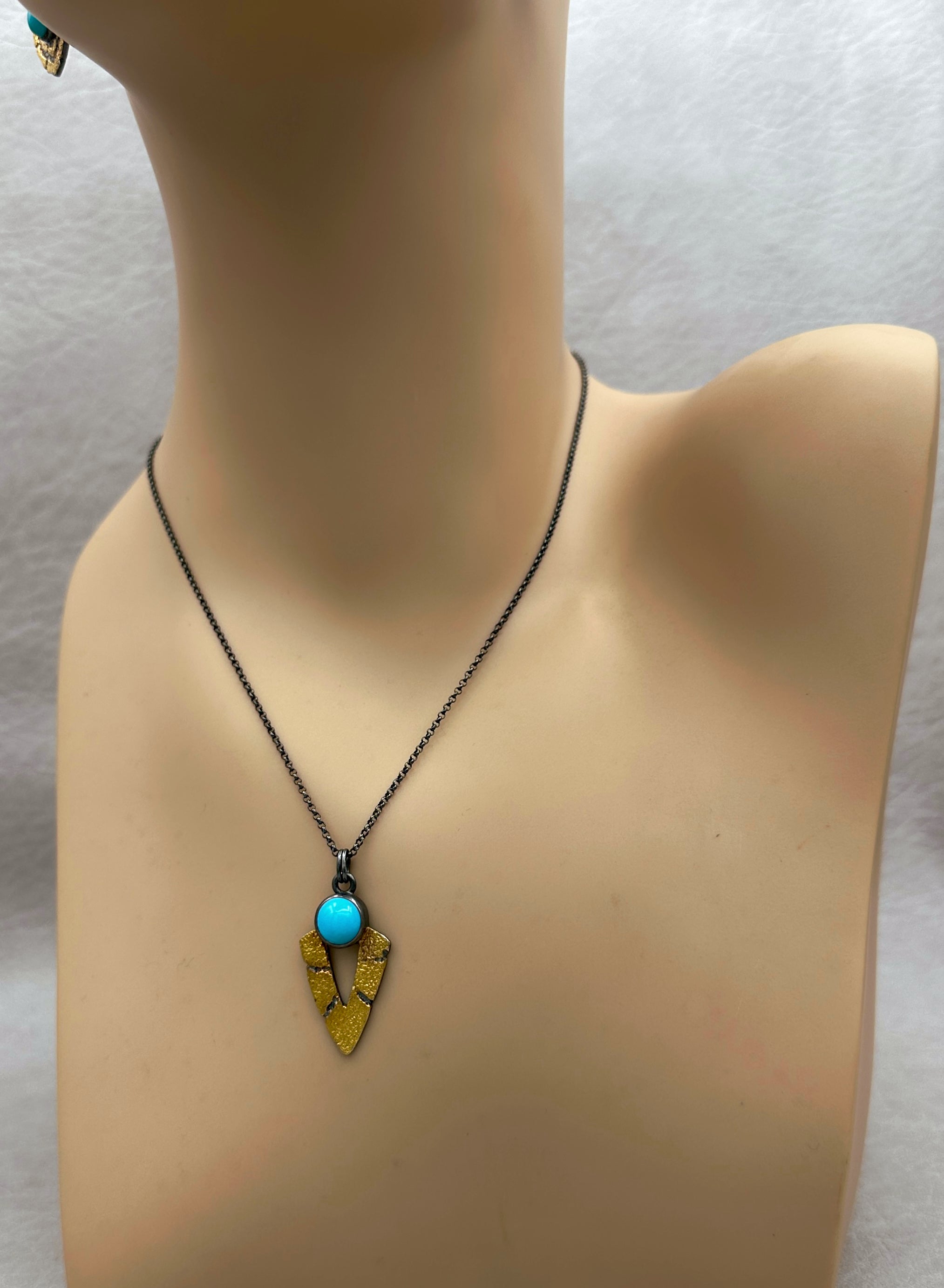 Graphic lines and bold colors combine in this ancient-inspired turquoise pendant. A cheery Arizona turquoise is suspended in a chevron of oxidized silver with 23k, in a classic arrowhead shape with modern edge.