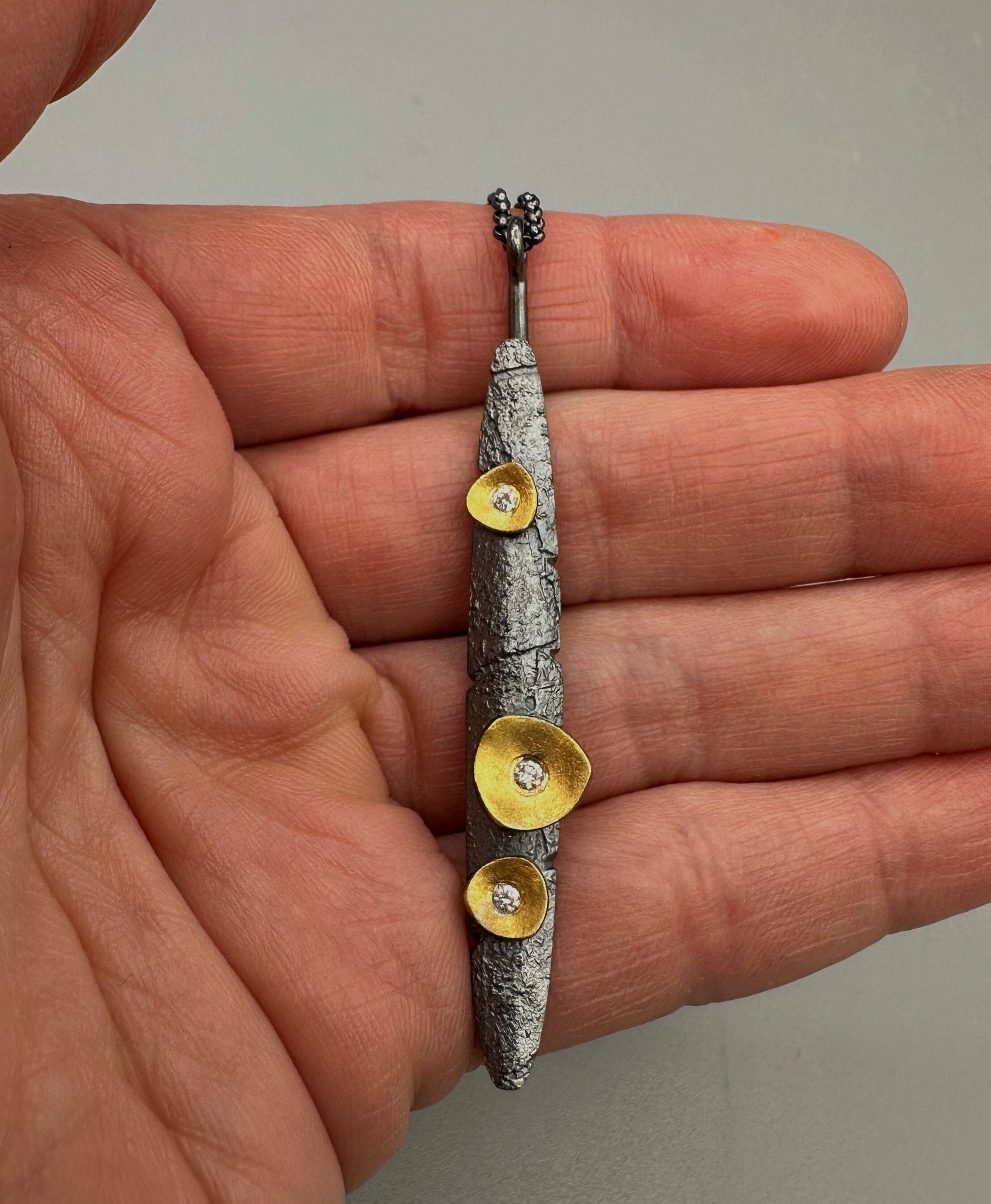 This oxidized silver and gold pendant features a streamlined shape with organic details that pop with color and contrast. An elegant taper of textured silver is accented with asymmetrical droplets kissed with 23K gold and lab-grown diamonds for extra sparkle.