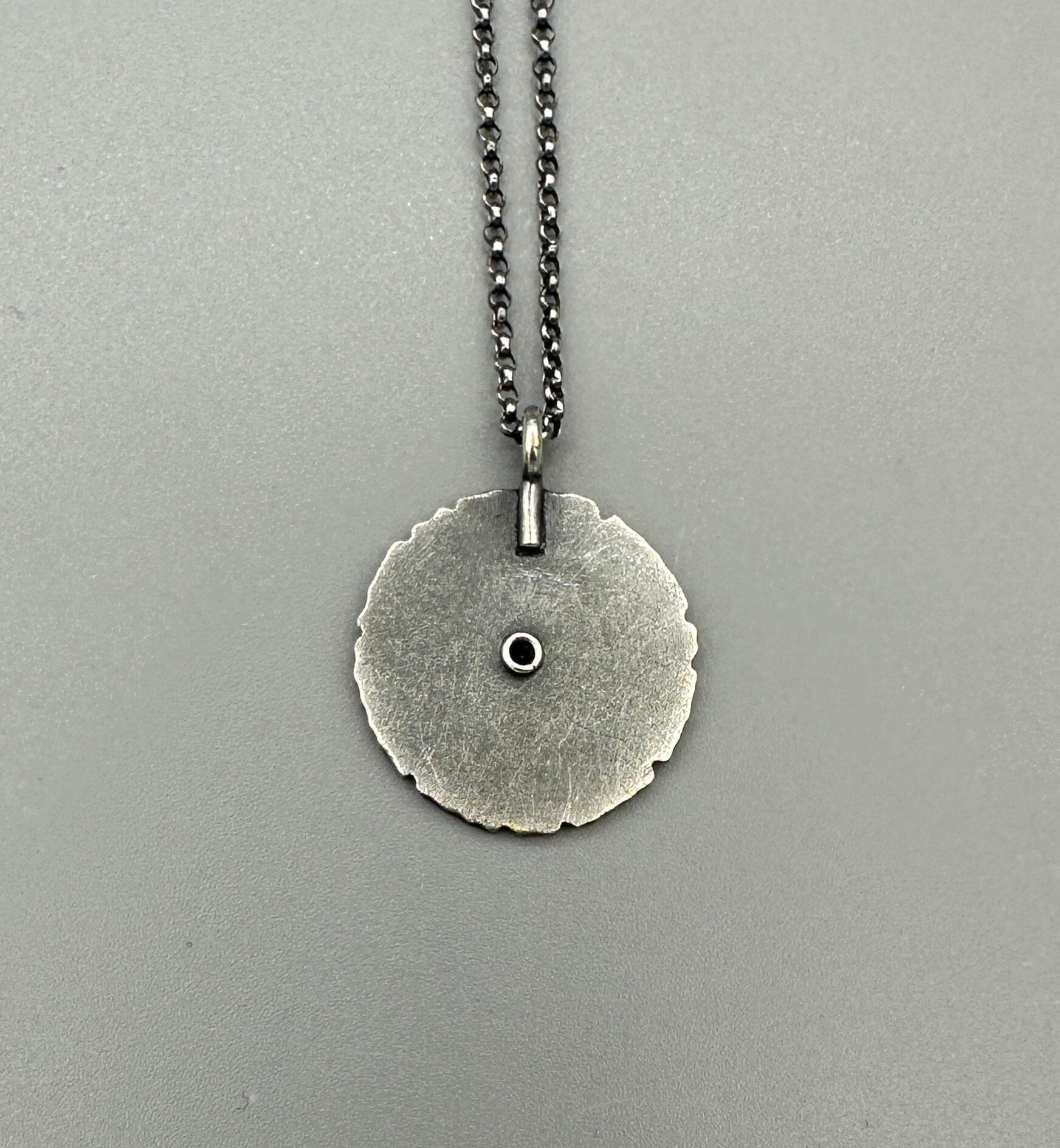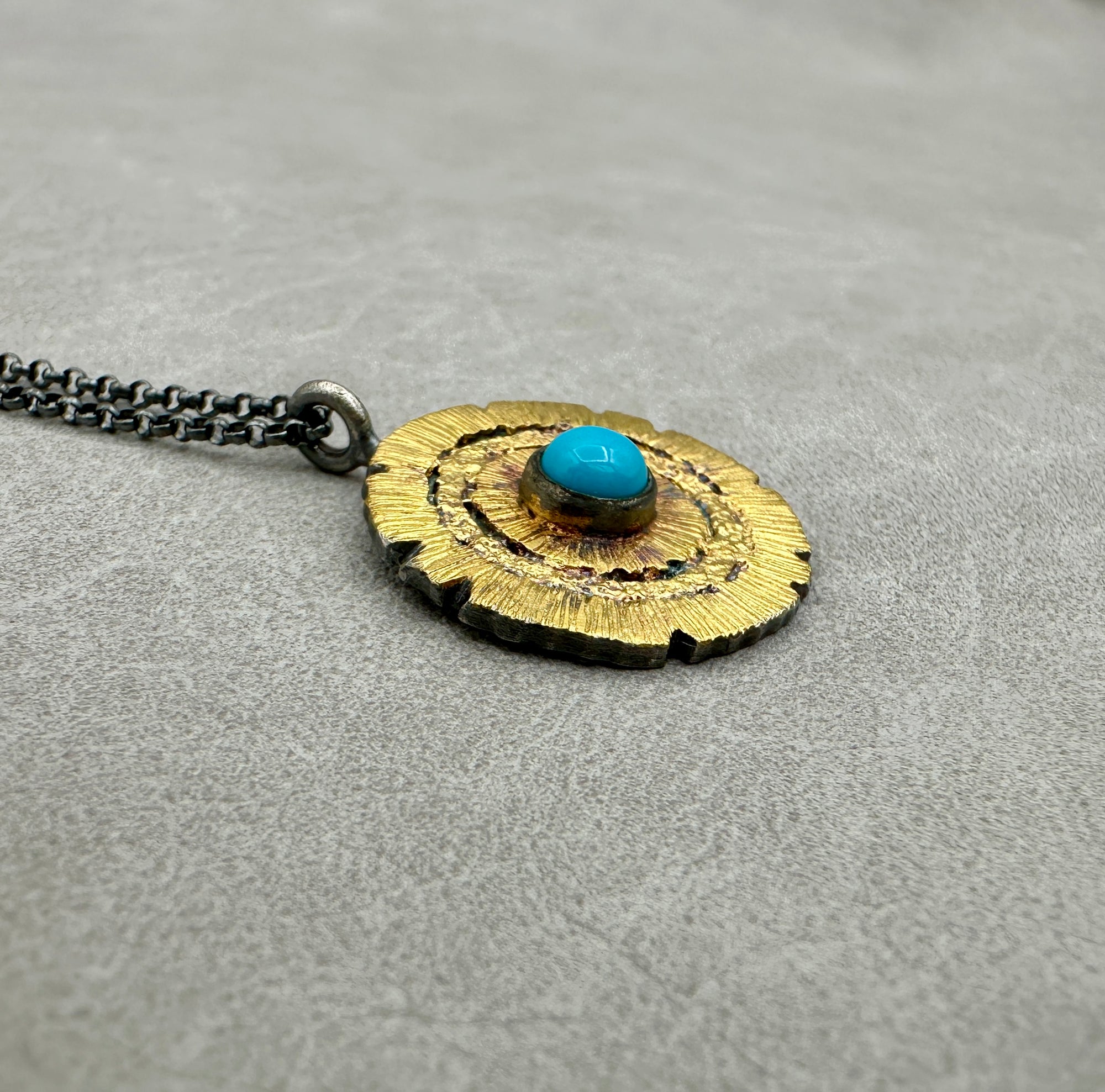 Inspired by the iconic redwoods, this pendant features a a bezel-set Arizona turquoise encircled by "tree rings" of textured oxidized silver adorned with 23K gold. Like a little tree slice with a pop of color you can wear everyday!