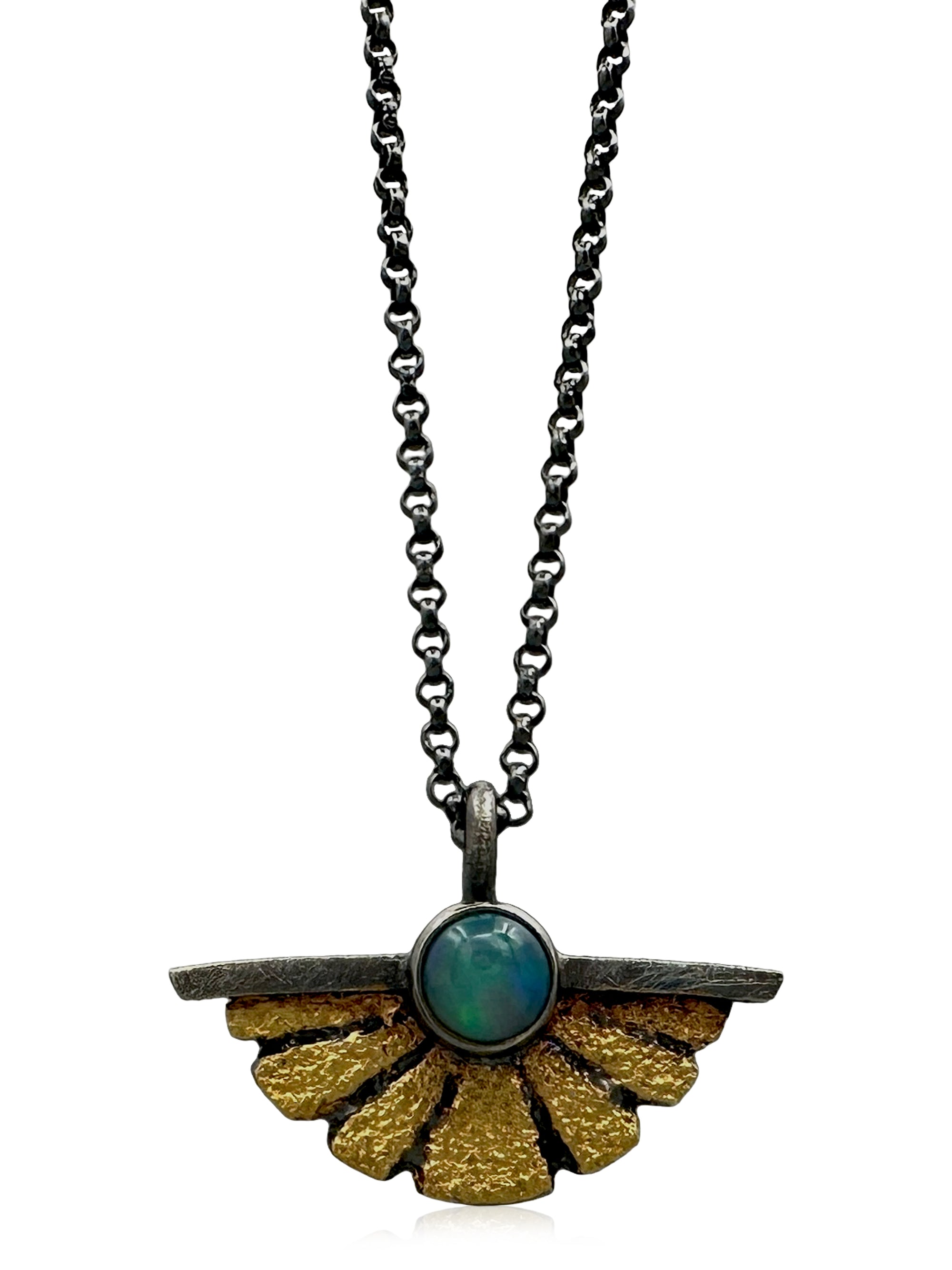 A classic shape with a modern edge, this opal pendant mixes graphic lines with earthy texture and a high contrast finish in a size that's perfect when layered or worn alone. Each stone is hand selected and oriented for maximum flash and beauty!