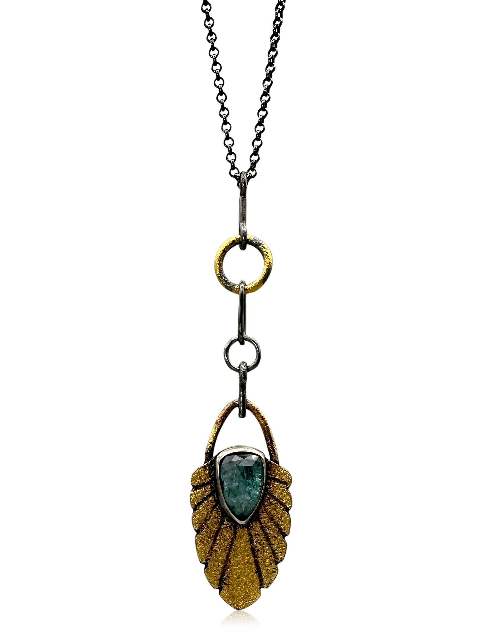 This sexy, glow-y teal kyanite drop pendant mixes earthy glam, goth-y vibes and modern edge in a sunburst design that emanates your inner glow! Textured, oxidized silver is carved and adorned with 23K gold, and drops from a series of links that's perfect for plunging necklines and adjusts long enough to wear over a tee.