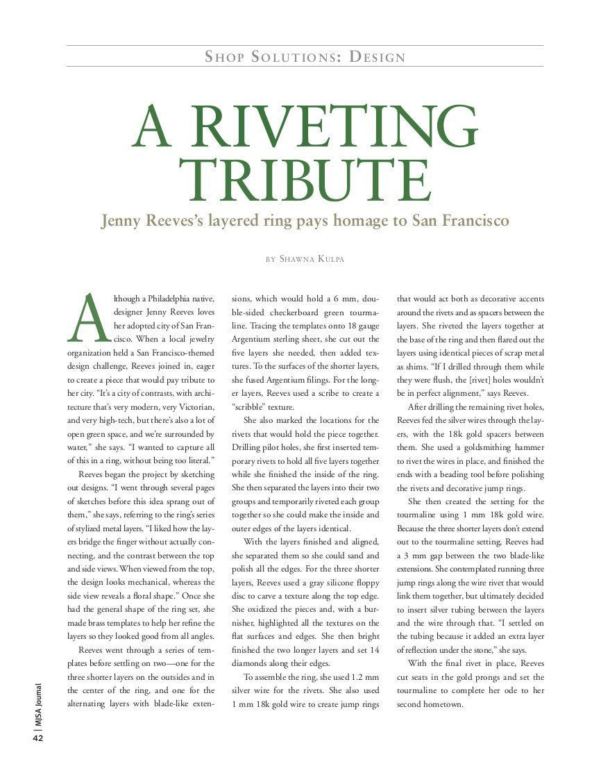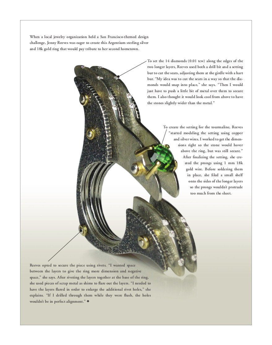 This unique and edgy ring features yellow gold rivets, white diamonds, and one stunning green tourmaline.