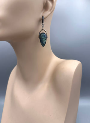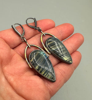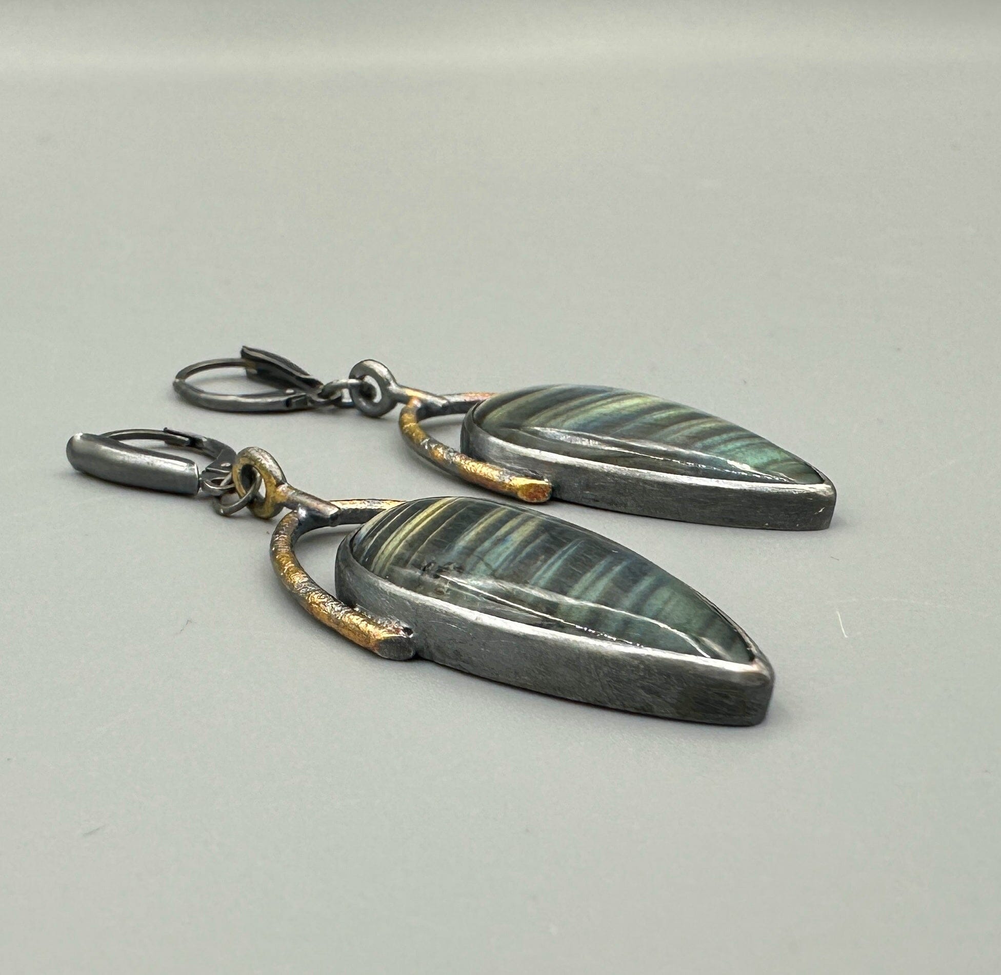 Mixing ancient-rune vibes with modern edge, these drop earrings feature chunky labradorites framed by textured, oxidized silver adorned with 23K gold. Large in size yet comfortable to wear, these one-of-a-kind stones have goth-y glamour perfect for day or night looks.